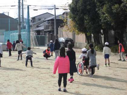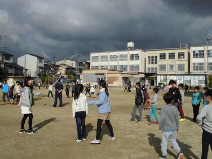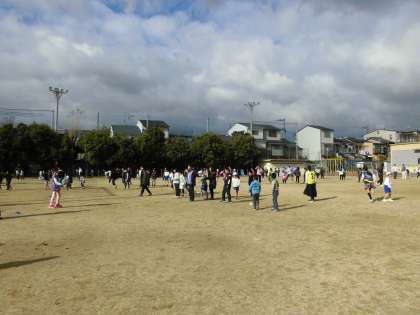 すっかり冬空になった今日の中間休み。全校でたてわり遊びをしました。6年生が中心になって計画し,たてわりのグループごとにいろいろな遊びを楽しみました。『ドッジボール』や『大なわ』。『だるまさんがころんだ』や『おにごっこ』をして寒さを吹き飛ばしていました。運動場に子ども達の元気な声が響きました。