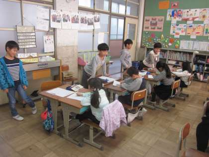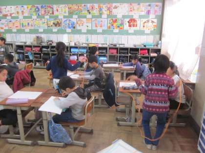図画工作の学習です。紙版画を作るため,まずは下描きをしています。友達がなわとびをしている様子です。