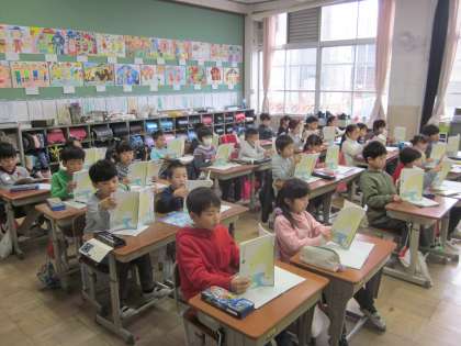 国語では,『わたしはおねえさん』の学習をしています。みんなで音読してみました。以前は声をそろえて読むことが難しかったのですが,耳も働かせて息を合わせて音読することが上手になってきました。一人で読むときも,点や丸に気をつけて読みましょう。
