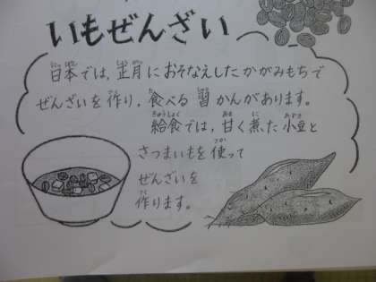 今日のデザートは,お餅のかわりにサツマイモが入った「いもぜんざい」でした。