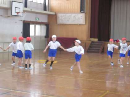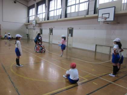 大縄跳びは,大波小波をしました。初めて縄を回したり跳んだりした子もいましたが,何度かチャレンジするうちにリズムよく跳ぶ様子もみられました。最後に両足の間で縄を止めるのはまだまだ難しそうです。