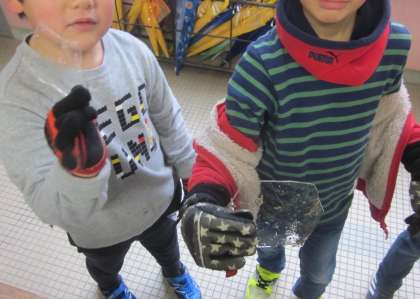 朝から元気よく運動場で遊んでいた子どもたちが教室に戻ってきました。「先生、氷があった!」と大きな氷を見つけてみせてくれました。冬ならではのもの発見です!