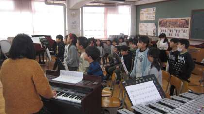 上と下のパートにわかれてきれいな声で歌う練習をしています。
