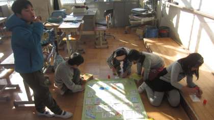 みんなで協力して給食調理員さんへのメッセジー作品を仕上げています。
