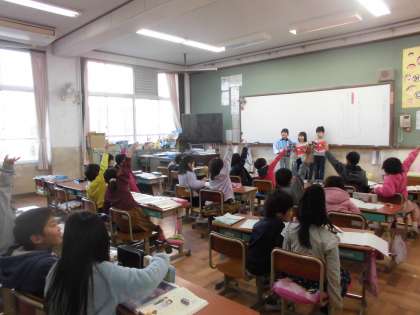 ものの特徴からヒントを考え,隣同士で話し合って,問題を作る学習をしています。出来た問題はみんなの前で出題しました。話し方や聞き方だけでなく,上手なヒントの出し方も楽しく学ぶことができました。