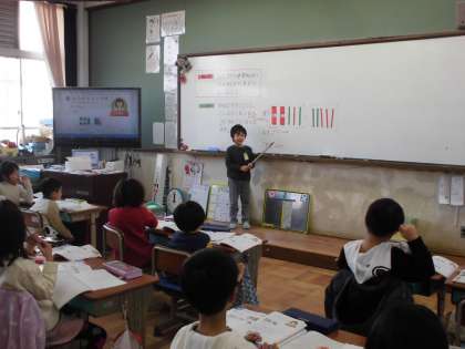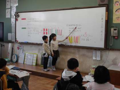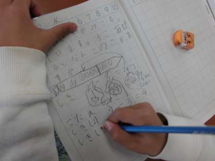 100までのかずの足し算・引き算の学習をしています。10のまとまりとバラに分け,足し引きすることが大事と分かりました。式と答えを出すだけでなく,図や問題文を使って計算の仕方を説明することにも慣れてきました。一人では自信のない子も二人で協力して発表しています。ノート作りも上手になってきました。