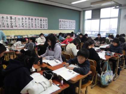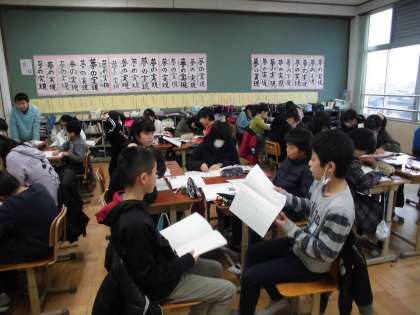 資料を読んで,自分の考えをまとめてノートに書いています。時間内に書き終わるように,集中して取り組んでいます。また,友だちの文章を読むことで様々な考えに触れています。