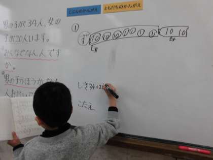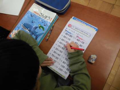 100までの数の計算のまとめをしました。図・式・答がつながっていることも実感できてきたようです。計算ドリルでも速く,正確に計算する練習をしています。