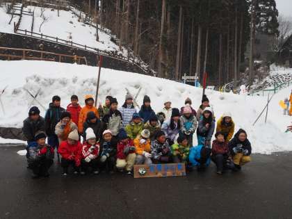 2月17日(日)雪遊びのあと、時間ができたので、写真屋さんが記念撮影をしています。周りは雪景色、子どもたちのテンションも上々です。