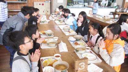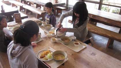 お昼ご飯の様子です。この日のお昼は鳥てり丼、塩ラーメンのいずれかを選びあと、コロッケや野菜の煮物、サラダをバイキングです。午前中の歩くスキーで体力を使ったせいかみんなよく食べます。午後は、当初歩くスキーで散策の予定でしたが、雪が少ないので、スキーではなく歩いて散策するトレッキングに変更になりました。