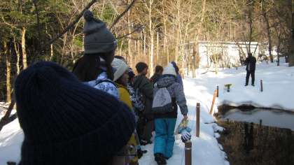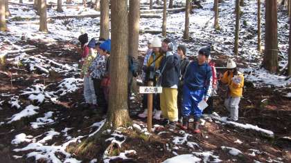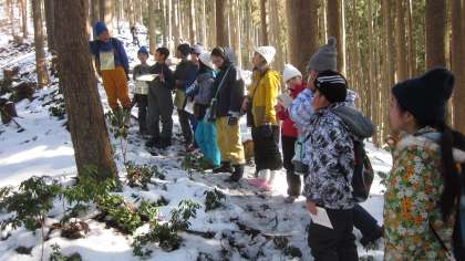 2月19日(月)午後のプログラムです。花背山の家の敷地内で自然観察ウォーキングです。ガイドの先生から、樹木についての説明を聞いたり、の雪上に残された動物の足跡などから動物の行動について学びます。実際に自然をみて聞く話に子どもたちも目を輝かせていました。