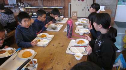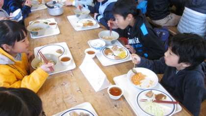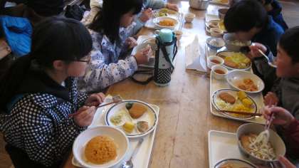 3日目の昼食です。この日はきつねうどんとチキンライスのどちらかを選択します。あとおかずはバイキング。子どもたちに聞きましたところ、この昼食の一品は鯖の竜田揚げだったそうです。揚げたてでおいしかったとこと。