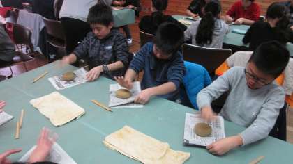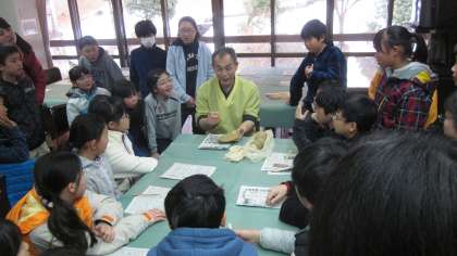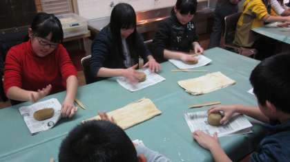 3日目 午後のプログラムの前半は「花背焼」です。粘土をこねて、思い思いの皿の形を作り上げていきます。完成した作品は3月に朱六小に届く予定です。