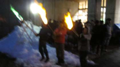 2月19日(火)花背山の家で行う予定でしたキャンプファイヤー。実は担任の山田先生は予てより、ある工夫を考えていました。それはトーチに含ませる液体を少し工夫することによって、炎の色が変わるという炎色反応を利用して、炎の色を変えるという演出を考えていましたが、残念ながらキャンプファイヤーでの使用には至りませんでした。ですが無念の極み、せめてトーチの炎だけでも披露したいということで、キャンドルファイヤーの前に子どもたちにお披露目となりました。赤、黄、緑の炎がトーチにともると、子どもたちから自然と「炎よ燃ろ」の合唱が響いてきました。予定にはなかったちょっとしたサプライズでした。
