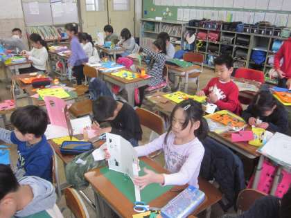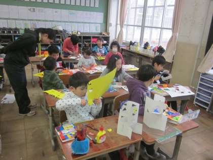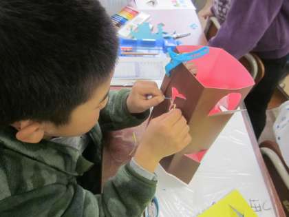 『まどをあけると』の学習をしています。カッターナイフで開けた窓から見えるものを作っています。作品展が楽しみです。