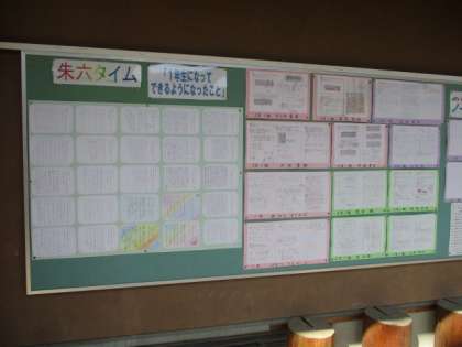 その横に、1年の朱六タイムだ発表した1年間でできるようになったことを作文にしています。またそのとなりには、きれいに書かれたノートを紹介しています。