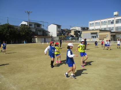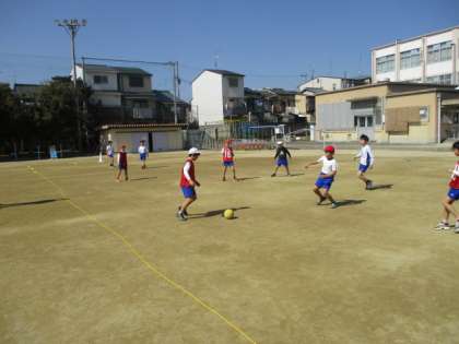 2月26日(火)4時間目の4年の体育の授業です。サイズの小さなコートでサッカーをしています。明るい日差しの下、元気な声が響きわたり、子どもたちの気持ちも明るくなります。