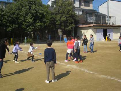 中間休みにみんな遊びでドッジボールをしました。とったボールを譲り合って仲良く遊んでいました。