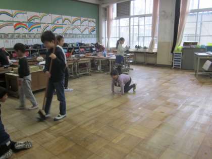 教室掃除,とっても上手です。ほうきも床雑巾も列になって上手に掃除していました。