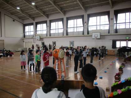 6年生が入場したあとは、各学年からの出し物です。4年生は「チャレンジ」という曲を合唱しました。6年生への応援歌です。