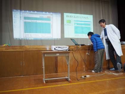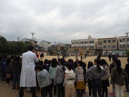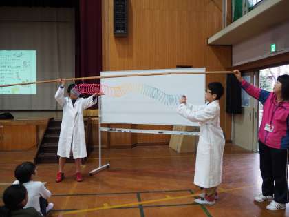音の伝わる様子や、音を見えるようにしたオシロスコープ、そして最後は6年生の全員による音速を体感する実験です。運動場で6年生に並んでもらって、音の伝わり方を確かめる実験でした。実験を見る時の子どもたちの驚きやキラキラと輝いた目をみているとやっていて楽しくなってきます。
