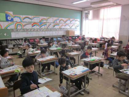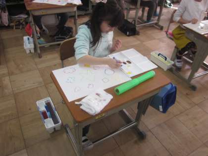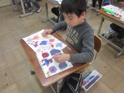 クレパスで書いた形に色を塗りました。赤・黄・青の3色の色を混ぜて,気に入った色を作って塗りました。水の量や絵の具の量をいろいろ試しながら楽しい作品ができました。