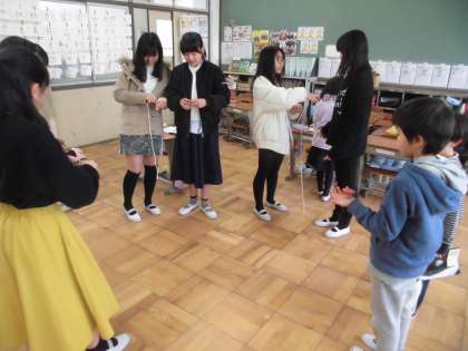 最近,6年生のお姉さんが1年教室へ来て「昔遊び」を一緒にしています。久しぶりのこま回しに苦戦するお姉さんたちを横目に,回してみせる1年生。何度も練習して「回せた!」と喜ぶ6年生がとてもかわいらしかったです。