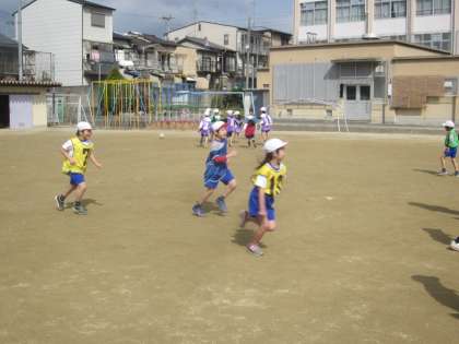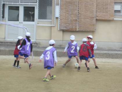 体育のある日に雨や運動場の状態がよくなかったため,なかなかできなかったボールけりゲームをやっとすることができました。ボールを止めた後,すぐにパスできるようよく動いていました。
