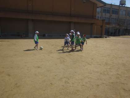 2年生最後の体育のボールけりゲームをしました。蹴ったりとめたり上手になってきました。