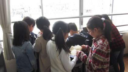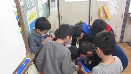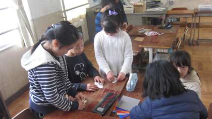5班のみんながいろいろなおり方を友だちに教えて犬や猫,飛行機などを折り紙で折っています。