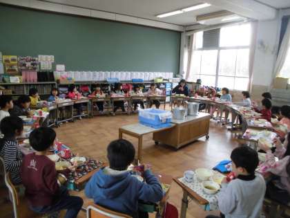 1年としての最後の給食は,みんなで円になって食べることに。いつもより楽しい気分でにこにこ笑顔でした。大勢で食べるっていいですね。