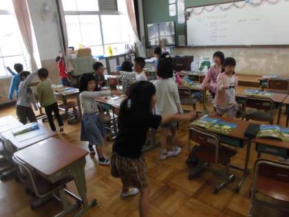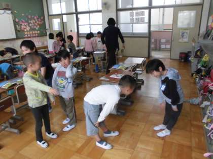 ぞうさんの真似をしながら歌って,歌の終わりに近くの友だちと「こんにちは」とあいさつをしました。手をぞうの鼻のようにふる子どもたちが,とてもかわいらしかったです。