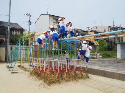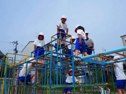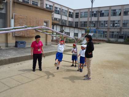 4月23日(火)1年の体育の授業の様子です。ジャングルジムや雲梯をつかってからだを動かしたり支えたりします。体育で使い方を教えてもらってから休み時間でも使います。楽しそうです。