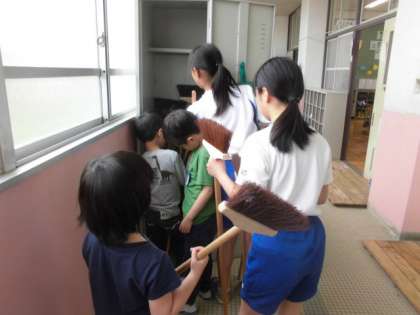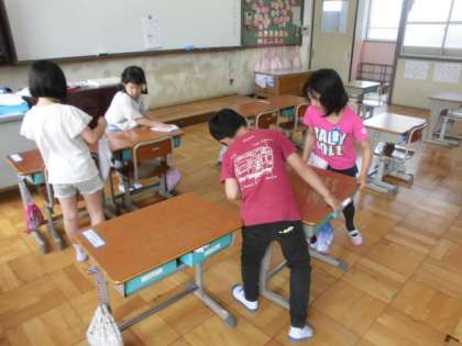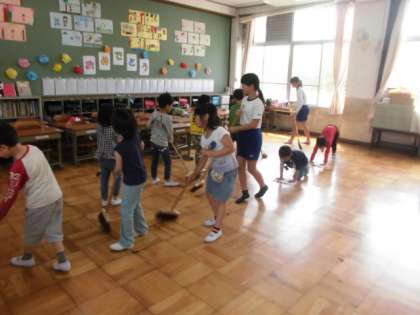 今日から,班ごとに役割分担をして掃除を始めました。しばらくは6年生が掃除の仕方を教えてくれます。用具の使い方や片付け方,机の運び方など少しずつ慣れていきます。