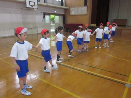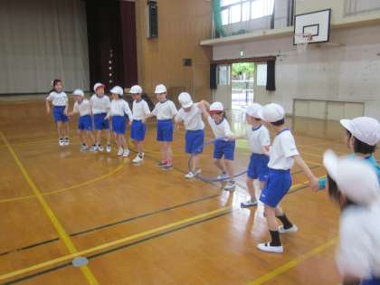 今日は雨が降っていたので,体育館で体ならしをしました。だるまさんがころんだをした後,声を出さずに順番に並ぶ学習をしました。「誕生日の順番に並ぼう!」というと「声を出さないと無理!」とはじめは言っていましたが,ジェスチャーを使って上手に並ぶことができました。そのあと,2チームにわかれて,フラフープを通す遊びなどを楽しみました。
