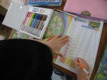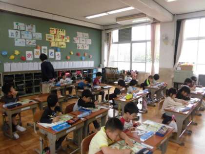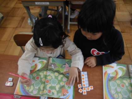 いろいろな果物の数を数え,絵グラフに表す学習をしました。今までは,数図ブロックを使って数えていましたが,印をつけながら数える方法も見つけました。