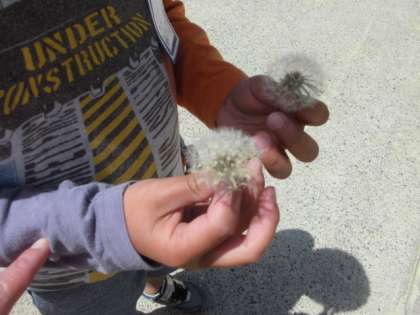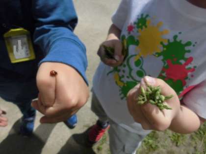 低学年は春見つけに夢中です。たんぽぽの綿毛,テントウムシ,カラスノエンドウ・・・いろいろ見つけては「先生!見て〜!」と嬉しそうに駆け寄ってきます。