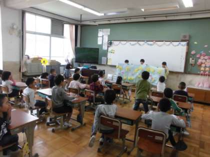 2年生が発表で使った花の掲示物をプレゼントしてくれました。たんぽぽ,ひまわり,コスモスが咲いている様子に「わ〜!きれい!」と子どもたちは大喜び。素敵なので教室前に飾ることにしました。