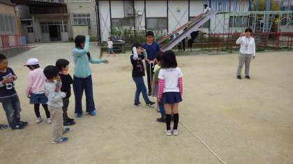 迎える会で参加できなかった1年生たちに声をかけて一緒に大繩をしています。