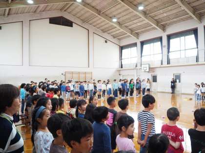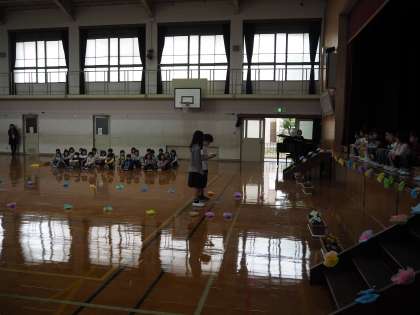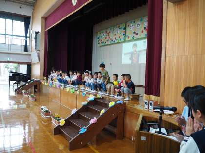 5月9日(木)1年生をむかる会のようすです。最初に全員合唱、そして計画委員の児童がお迎えのことばを1年生に伝え、次に1年生の児童の紹介をしました。名前を呼ばれた1年生は元気に返事をしていました。