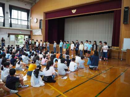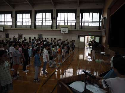 5月14日(火)第1回の児童朝会を行いました。新しい計画委員の児童が司会進行していきます。まず全校合唱、そして新しい計画委員、クラス代表委員などの委員長の認証をしました。そして今年度の児童会の目標の発表を計画委員4名の児童が行いました。今年の目標は「みんなが明るく笑顔でがんばれる学校にしよう」です。児童会は子どもたちが自治を学ぶ大切な場所です。児童会のみなさん頑張ってください。先生はみなさんの力で朱六小がますます、楽しく明るい学校になることを願っています。