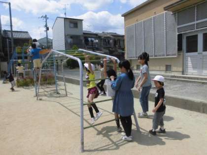 休み時間になると他学年の子たちが教室へ誘いに来てくれます。今日は,6年生のお姉さんにうんていや鉄棒の技を見てもらっていました。「すごーい!!」とほめてもらい,とても嬉しそうでした。