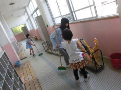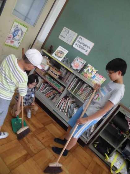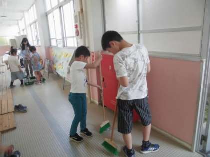 6年生が1年生に掃除の仕方を教えに来てくれています。ほうきの使い方やちりとりの使い方も上手になってきました。6月からは自分たちでできるようになれるかな?