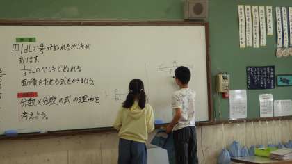 自分の考えを黒板に書き説明しています。今までに学習したことをいかして説明していました。