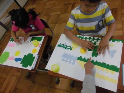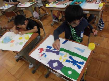 今日は,先週作ったチョキチョキかざりを画用紙に貼った後,想像を膨らませてパスで描きたしたりしました。完成までもうすぐです。どんな作品が出来上がるか楽しみです。