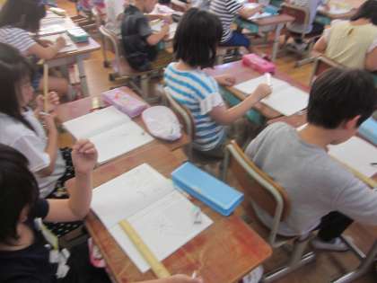 ものさしを使って直線をかく学習をしました。はじめに直線をたくさんかきました。そのあと7cmになるように直線をかきました。ものさしをしっかりと押さえることで,まっすぐな直線をたくさんかけるようになってきました。