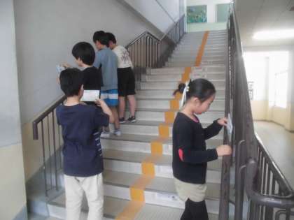 教科書にある「かたむき分度器」を作って,傾斜があるものの角度を測りました。仕組みを考えながら,平面ではない階段の手すりや滑り台などの角度測定に進んで取り組む姿がありました。