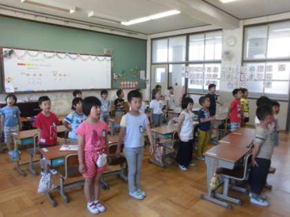 はくを感じて,なまえあそびをしました。「たん・たん・たん・うん」のリズムで「○○さん」と呼ばれたら,手拍子をしながら「はあい」と返事をします。はじめは手と声が合わせるのが難しそうでしたが,何度も練習して上手になりました。また,歌詞を見ずに校歌を歌うのにも慣れてきました。