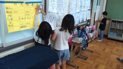 ものさしを使っていろいろなものの長さを測りました。土曜参観日の学習で,10cmはどのくらいかを手を使って表す学習をしました。今回はそのだいたい10cmを生かして予想をし,そのあと実際の長さを測りました。カレンダーやホワイトボードのよこの長さなど長いものも予想して測りました。