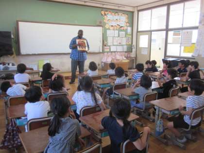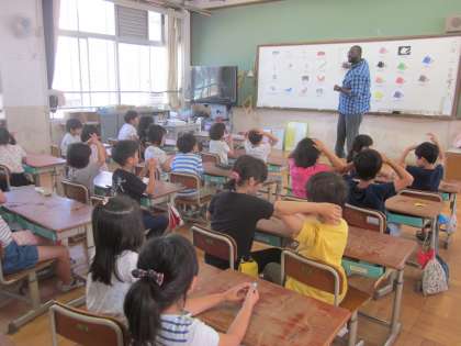 テビン先生にBrown Bear の本を読んでもらったあと,色や動物の名前の学習をしました。色の名前はよく覚えていて,ゲームも盛り上がっていました。